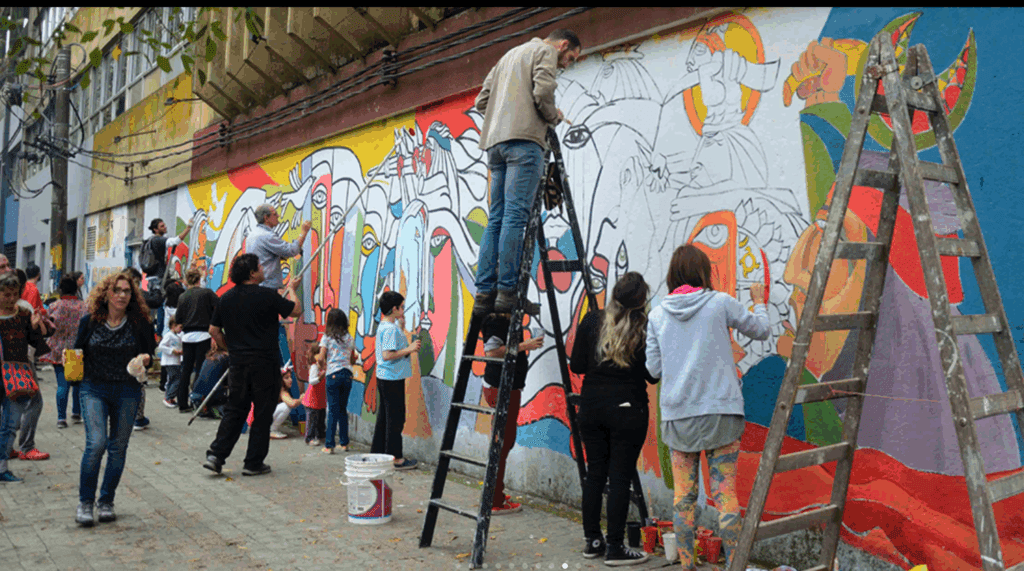 Vecinos realizando mural en una de las paredes de La Vigil